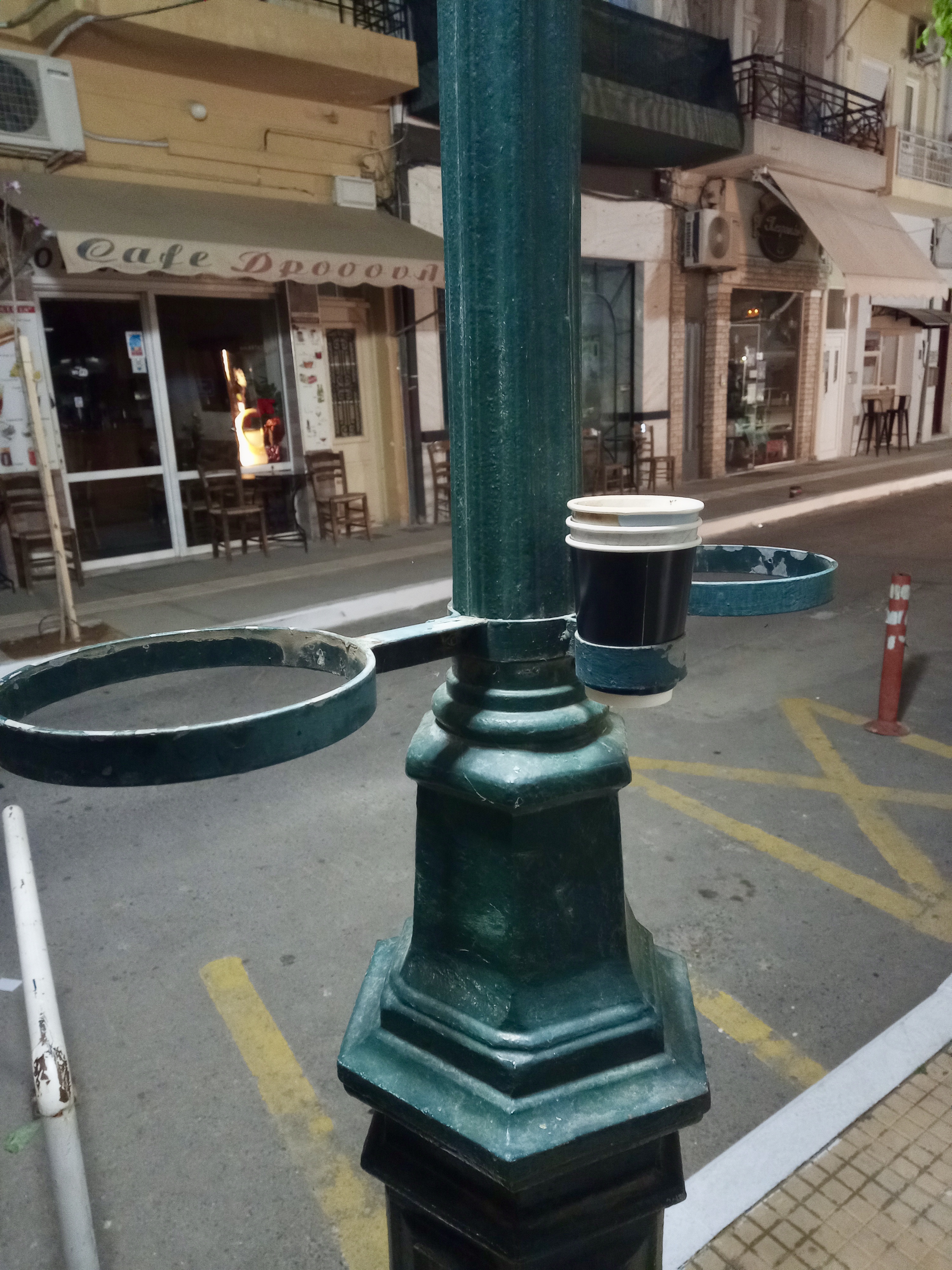 The first photo in that gallery above really amused me. Let’s admit it, the Greeks are eminently civilised when it comes to café culture, aren’t they? I mean, that street lamp post had two holders for plant pots, which in this instance (an exception, I have to say) weren’t in use, but the extra one? It just had to be made for people to place their coffee in right?