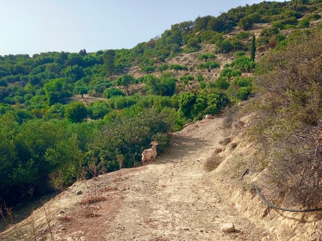 I was trudging around Dingly Dell the other day, since I’d failed to drop off to sleep during the afternoon, and I came across one of the local goat herds. You don’t have to see them to know that they’re in the vicinity, because the clanging of their bells (I wonder if they ever get driven mad by those things hanging permanently around their necks) signals that they’re approaching, or that you’re approaching them. On this particular occasion, as they came into view, I also heard the telltale sound of the goatherd whistling and calling to them, usually to get them to go in a specific direction. I stopped in order to ascertain where the goatherd was, because, if he wanted the goats to pass anywhere near my position, I might well have proven to be a nuisance. Goats here will generally avoid any humans with whom they’re not familiar, and so, if I come into their field of vision, they’ll change direction so as not to allow me to get within about ten metres of them. I stood stock still as a couple of goats emerged from the undergrowth onto the lane a little way ahead of me, and scanning the hillside I could see the goatherd a couple of hundred metres across the valley.