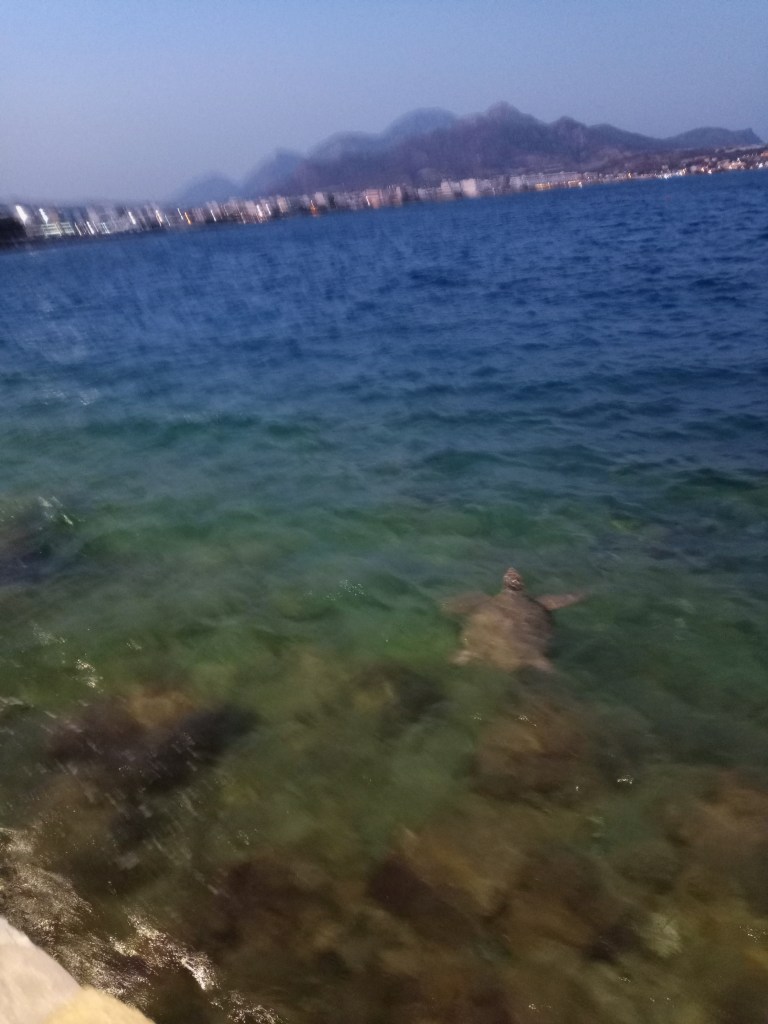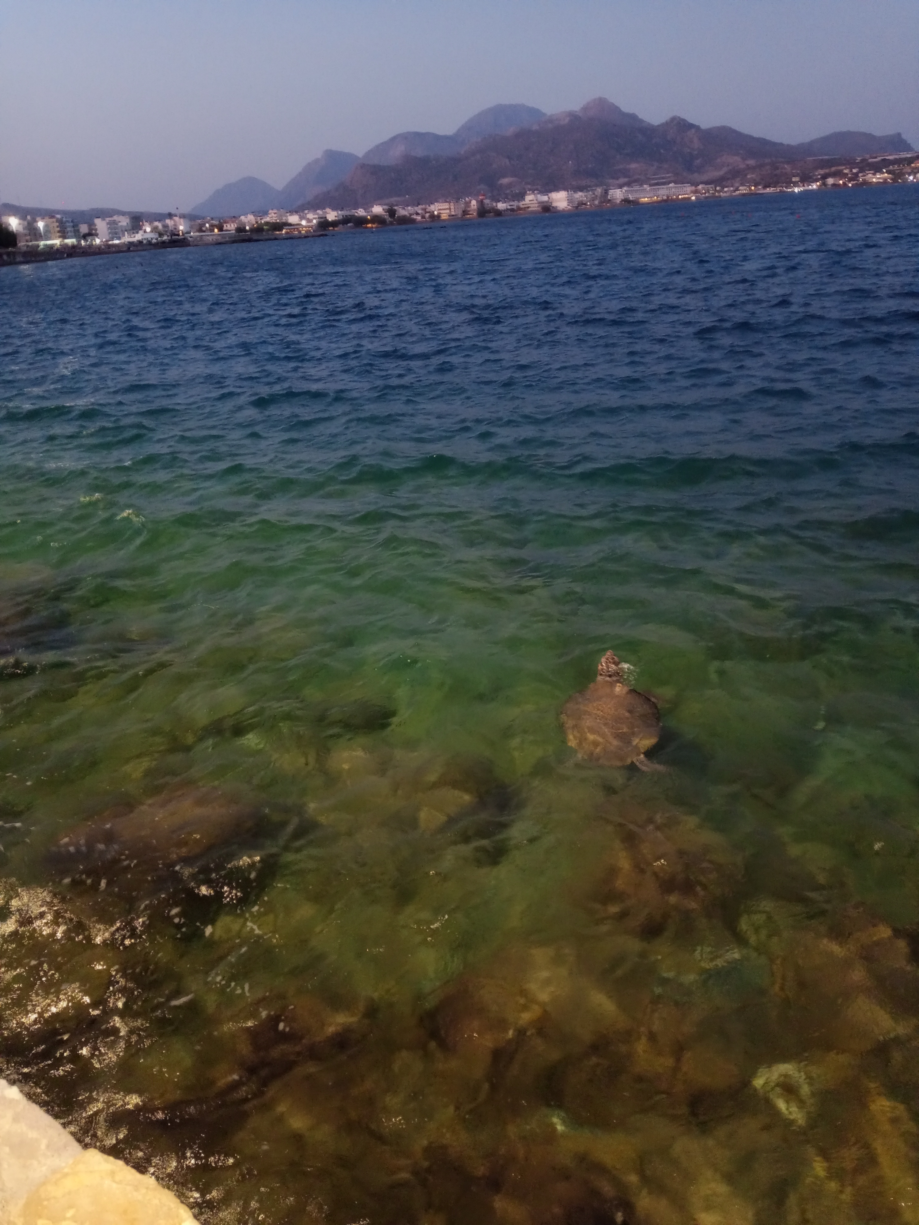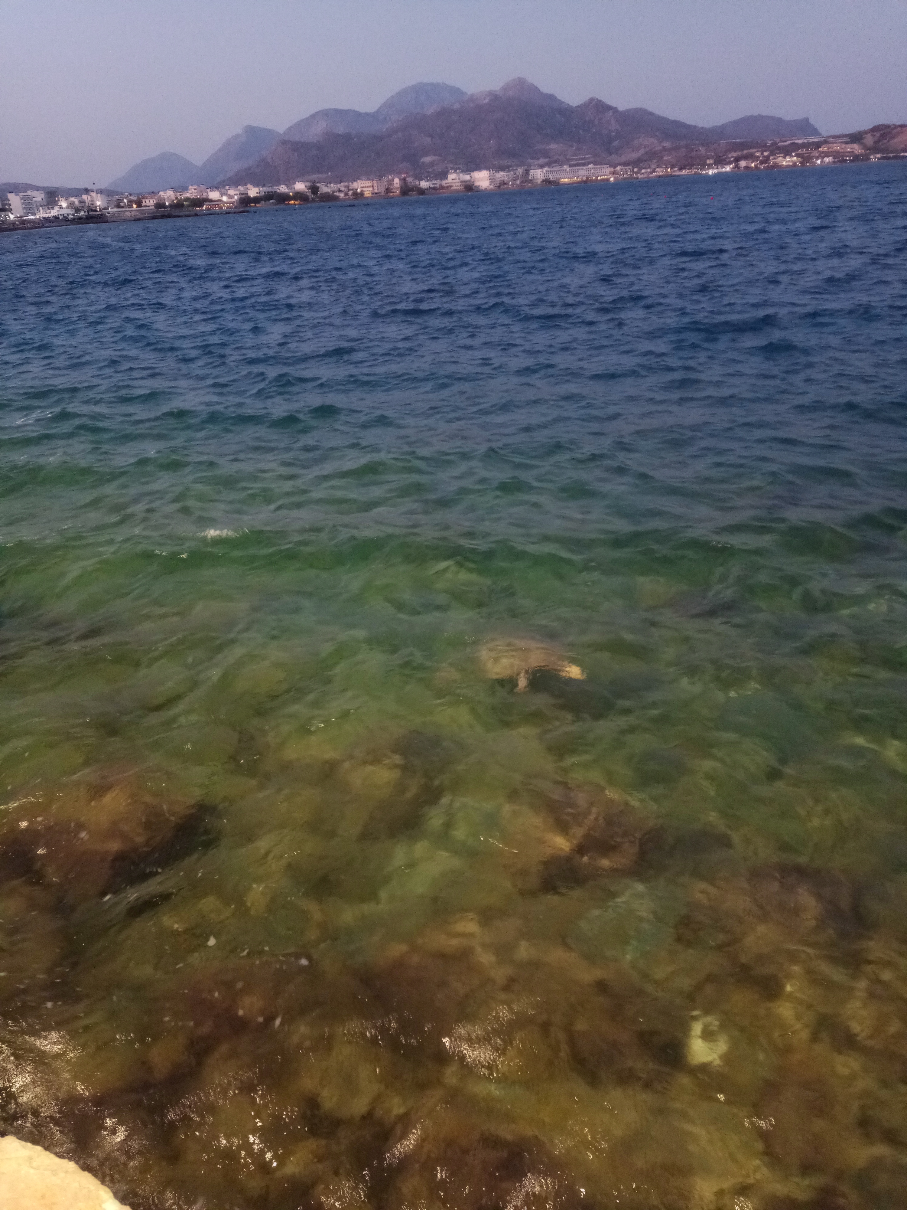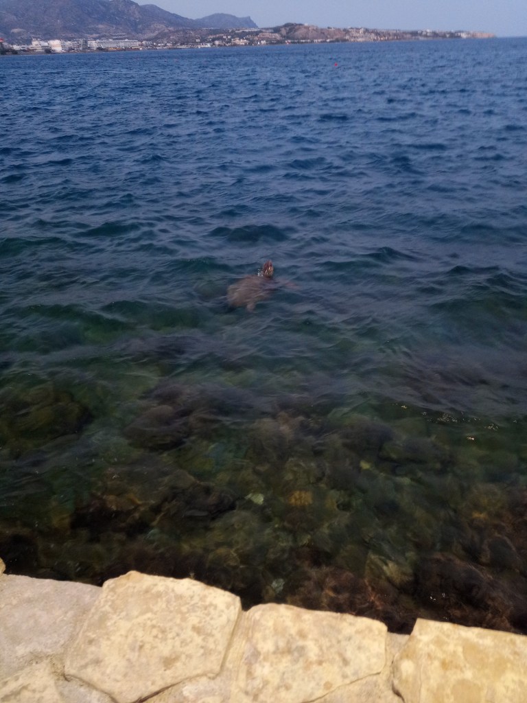 And so to the photos. The top photo on this post was taken at dusk as we ate a delicious meal at the waterside restaurant the Vira Potsi, right beside the Venetian Fortress that stands at the entrance to Ierapetra Harbour, last Monday evening. Not only did one turtle turn up, but a pair of them. My photos aren’t all that good, but here are the rest of them anyway, as just about everyone who was dining that evening crowded to the edge of the quay to strain to catch sight of these wonderful, elegant, gentle creatures…