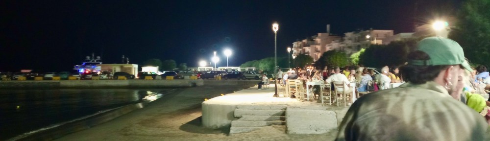 Above: Last Saturday evening, at around 10.00pm. The sea front at L’Angolo restaurant was buzzing. These heat-waves may be a bit difficult to deal with, but late in the evening, when the temperature’s hovering at around 30ºC, the best place to be is beside the sea. So that’s where we were, to enjoy our usual epic green salad with a large Pizza, not bad.