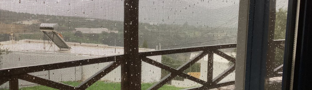 Usually, when it rains here in winter, we can still sit out on the veranda to drink our coffee in the mornings, because the rain seldom gets the place wet at all. When the wind’s in this direction though, the veranda gets soaked, and we even have droplets of water on the mosquito nets in front of our French windows…