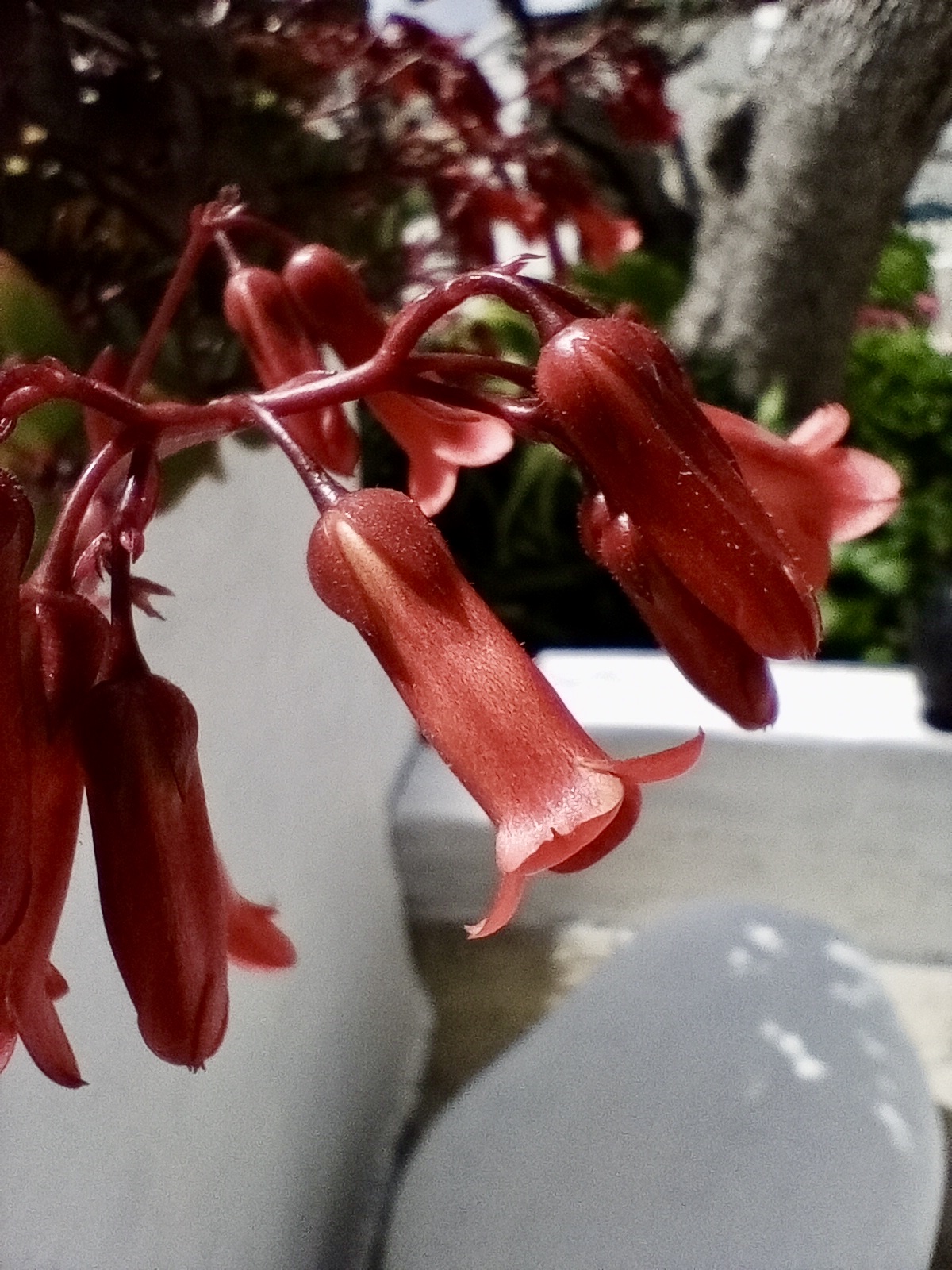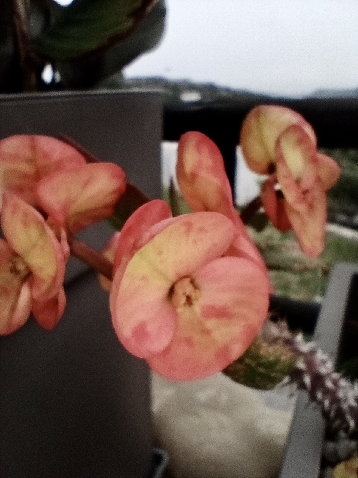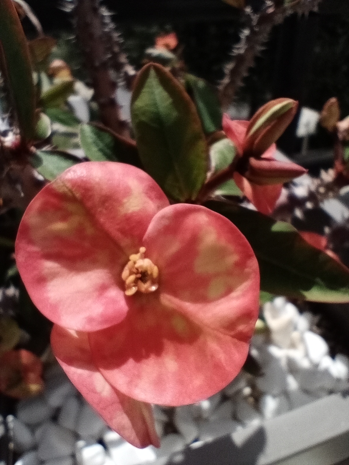 The plant below is evident in pots in most gardens in this area, largely because it’s a near-impossibility to kill it. It needs very little water and flowers most of the time. It’s common name is ‘Crown of Thorns,’ for obvious reasons. Not a lot of people know, though, that it’s actually a plant in the Euphorbia family. You’d never think so at first glance though…