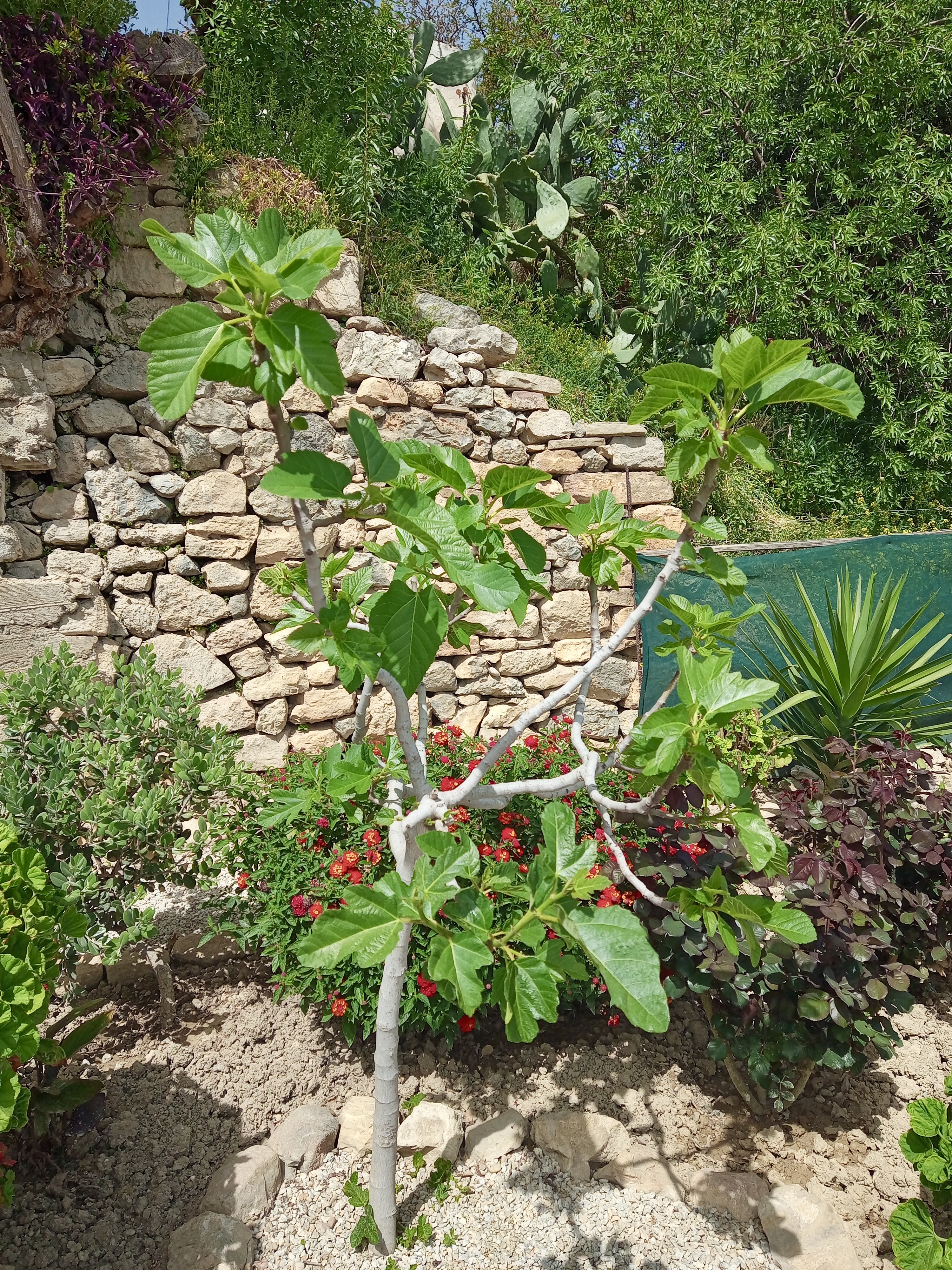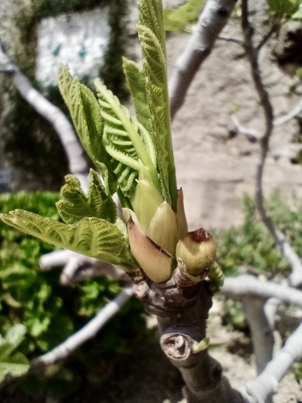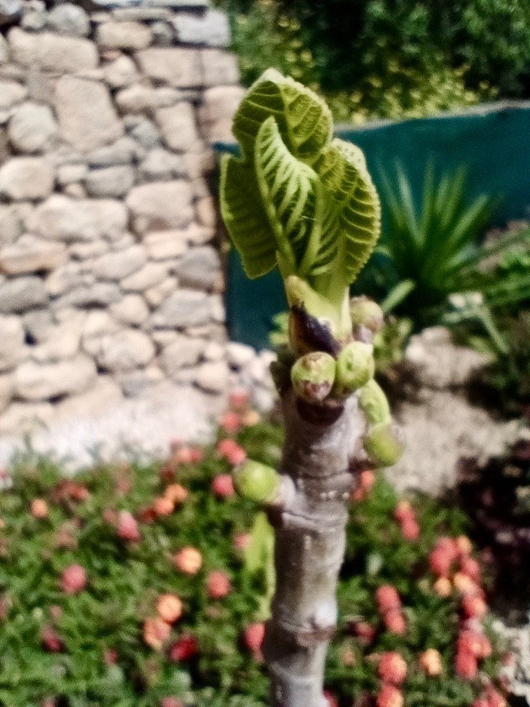 So, all in all, we can’t complain. This past week or so it has been unseasonably warm too. We’ve had June temperatures, a marked change from last year, when all through March, April and even into early June the changeable weather continued. The garden’s literally bursting with new growth. Here are some photos as proof of that. Firstly, look how quickly the fig tree is blooming, and the figs that we shall be eating come July are already in evidence, currently about the size of a pea. These photos represent the changes in just two or three days…