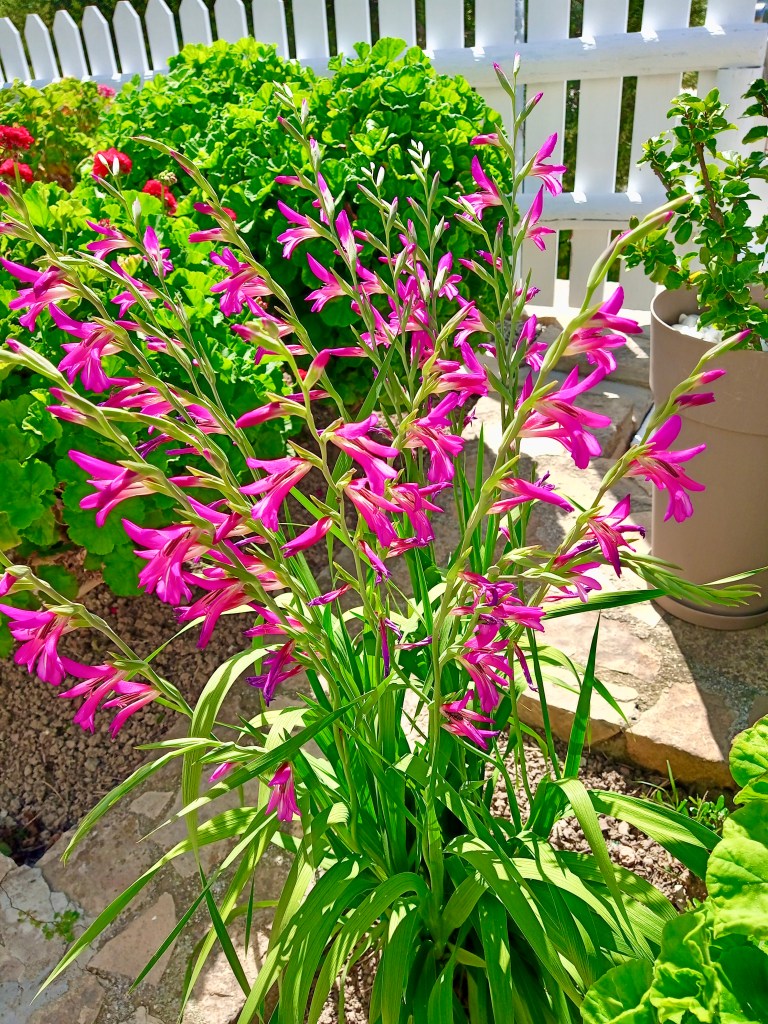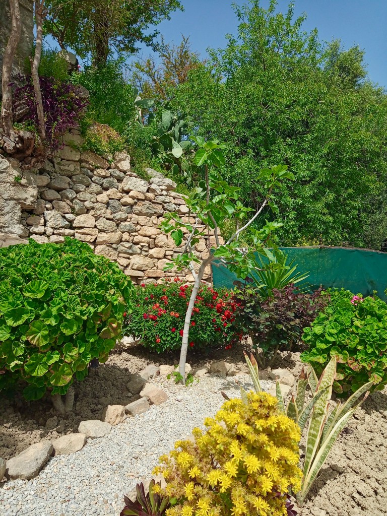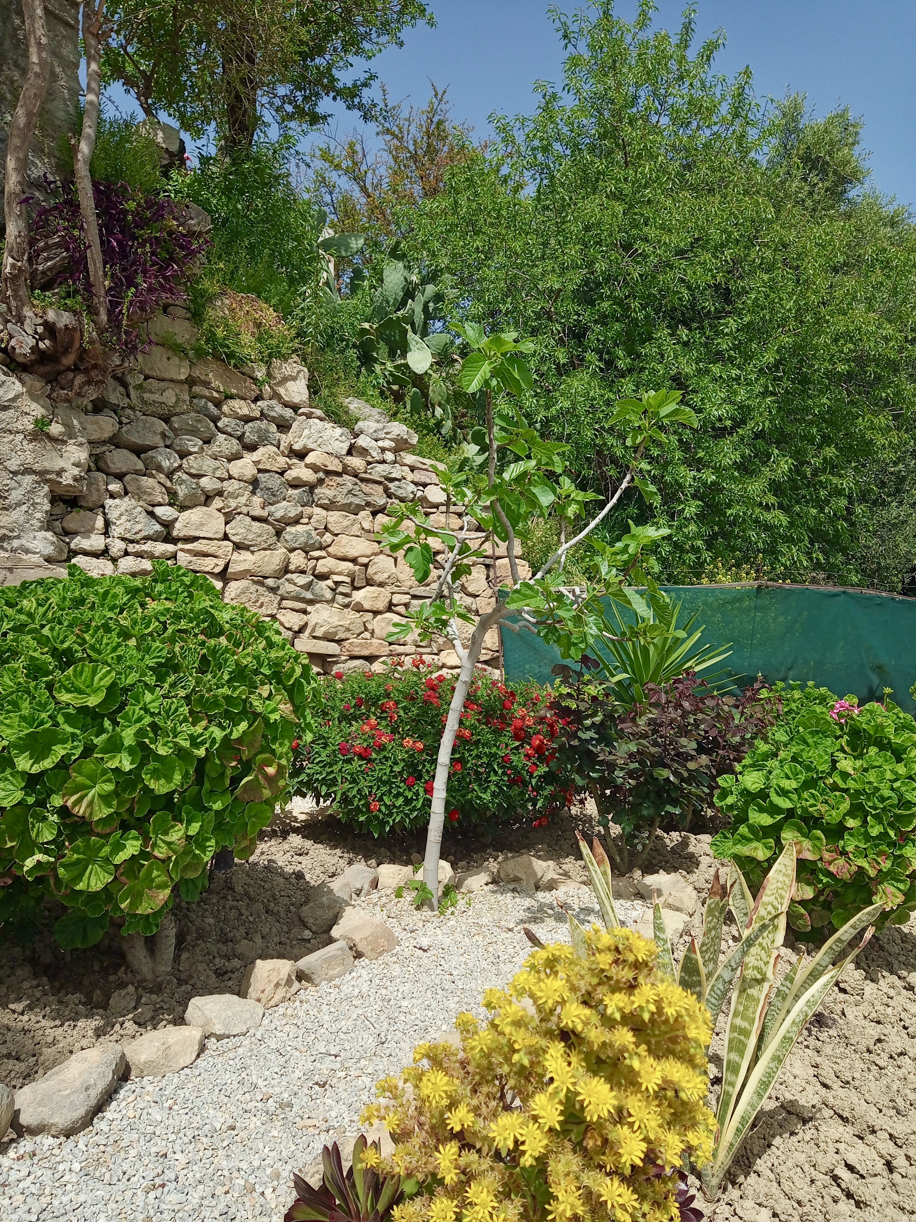 When we got back home on the weekend of May 4/5, we were soon tasked with rescuing the garden from drought. Everything needed watering. While we were pottering about – me with a hosepipe and Yvonne with some secateurs – in the lower garden, just across the lane from Evangelia’s house, she came out to the end of her lane and caught sight of us.