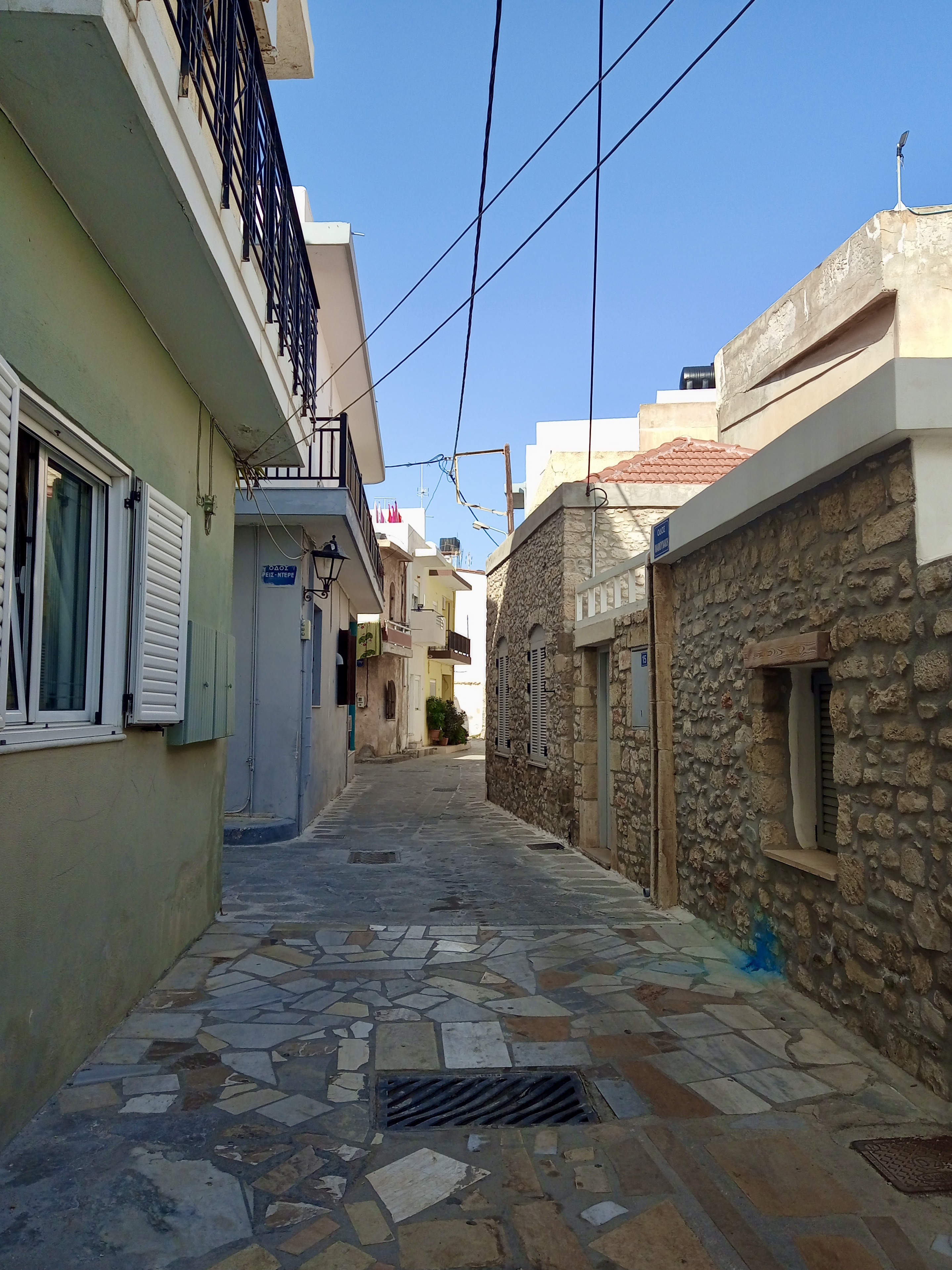 Something else which says a lot about life in this little corner of the world, and once again I know I’ve probably laboured this point before, is the fact that everywhere you go in the dead of night, all the cafés and restaurants have left their tables and chairs in situ outdoors. Come on, let’s be honest, can you imagine anywhere in the UK (and a few other European countries besides) where businesses could do that? Even wandering the narrow shopping streets of Sitia (and this also applies to Ierapetra) you pass stores with large areas of glass, both windows and doors, that are only secured by a small security bolt at the bottom of the door. The store may be an electrical store selling computer accessories, a clothes or shoe shop, or whatever, but in most UK cities there would have to be roller shutters drawn down and closed tight during the night hours, surely. I walked those streets alone and in a complete sense of security, a blessing indeed.